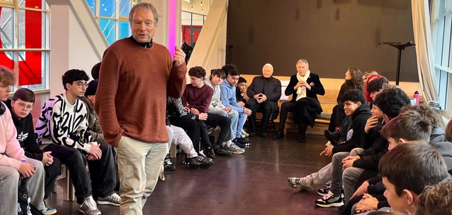 Im Mittelpunkt stand die Auseinandersetzung mit Antisemitismus, Erinnerungskultur und den Lebensgeschichten von Holocaust-Überlebenden. Das Theaterstück, das auf einer Graphic Novel basiert, erzählt aus der Perspektive jüdischer Kinder vor und während der Zeit des Nationalsozialismus – ein Zugang, der für die Schüler:innen besonders greifbar war. Beeindruckend schilderte der künstlerische Leiter des Jungen Schauspielhauses, Stefan Fischer-Fels, von der Aufführung des Stückes am Handlungsort des Geschehens in der ukrainischen Stadt Czernowitz, von der er einen Tag zuvor zurückkehrt war.