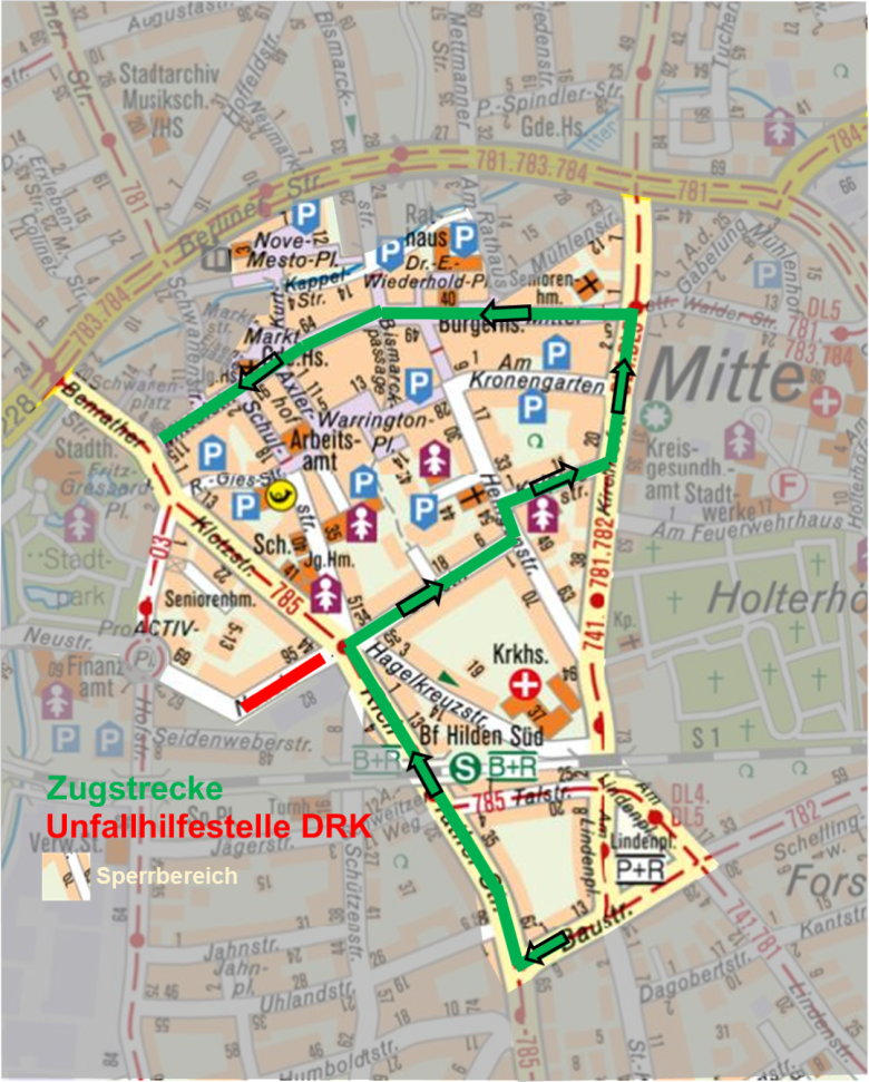 Damit der Rosenmontagszug reibungslos durch die Innenstadt ziehen kann, werden der Straßen- und Busverkehr am 16. Februar von 12.00 bis voraussichtlich 18.00 Uhr großräumig umgeleitet. Entsprechende Umleitungen sind ausgeschildert. Anwohnende im Sperrbereich (siehe Karte), die ihre Fahrzeuge nach 12.00 Uhr benötigen, werden gebeten, diese außerhalb des gesperrten Bereiches abzustellen. Entlang der Zugstrecke werden zudem Halteverbotsschilder aufgestellt, die unbedingt zu beachten sind. Widerrechtlich parkende Fahrzeuge lässt das Ordnungsamt vor Beginn des Zuges abschleppen.
