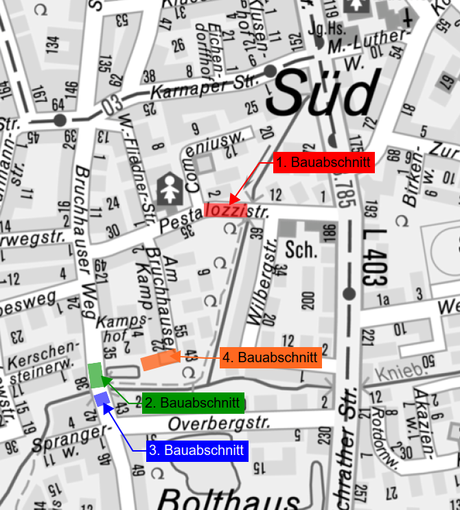 Ab Montag, 17.11.2025 wird die Karnaper Straße zwischen Wilhelmine-Fliedner-Str. und Bruchhauser Weg für den Durchgangsverkehr bis voraussichtlich zum 19.12.2025 gesperrt. Radfahrer und Fußgänger sind davon nicht betroffen. Eine Umleitung ist ausgeschildert.