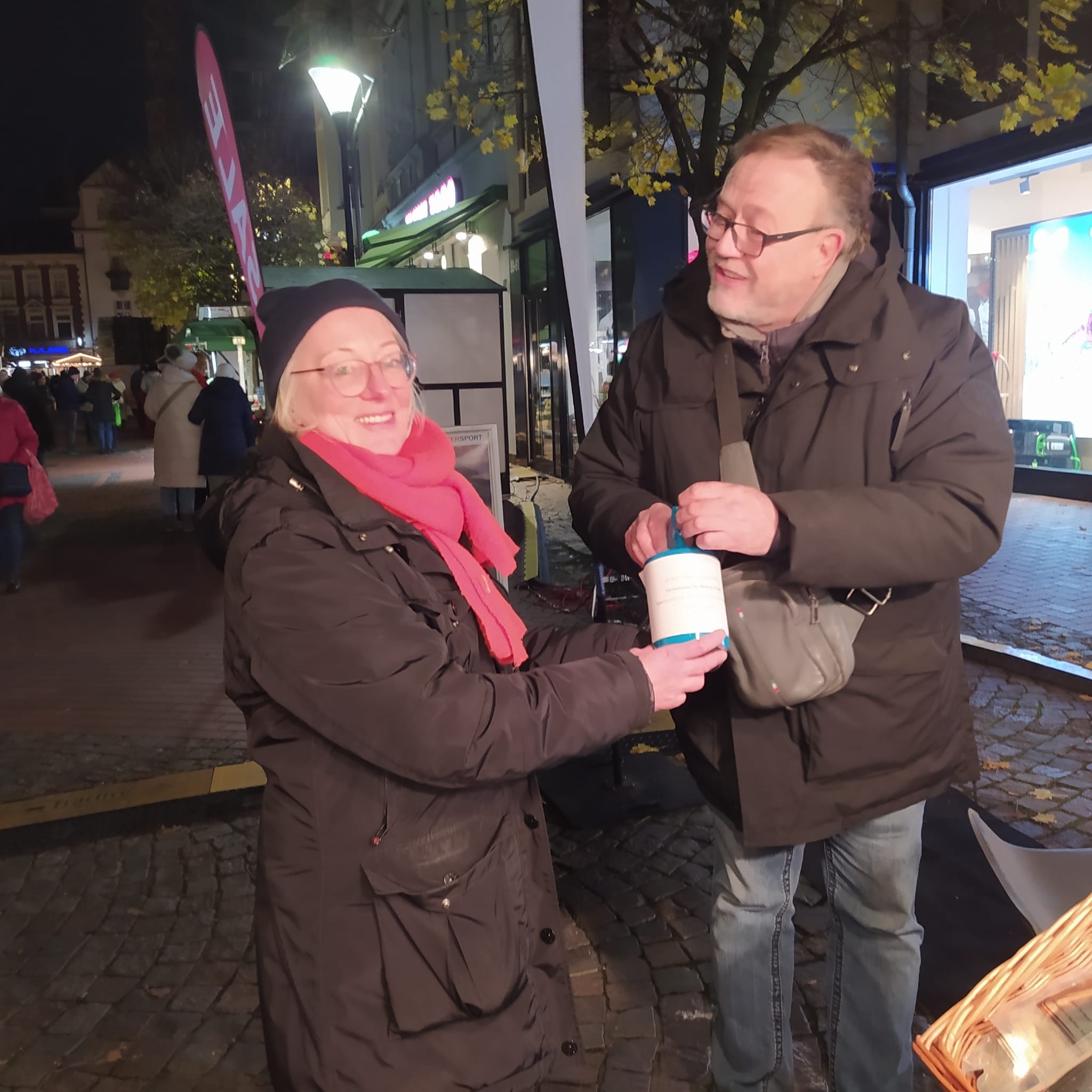 Auf dem Hildener Weihnachtsmarkt haben der Internationale Frauentreff und die Gleichstellungsstelle der Stadt Hilden für das WDR Weihnachtswunder gesammelt. 2023 heißt das Spendenziel: „Gemeinsam für Mütter in Not“. Viele Markt-Austeller*innen haben jeweils zehn Euro ihres Erlöses für den guten Zweck gegeben. Manche sogar mehr. Insgesamt sind über 500 Euro zusammengekommen. Diese Summe bringt Angelika Hamann vom Internationalen Frauentreff persönlich beim WDR2 Glasvorhaus vorbei. „Als Musikwunsch haben wir „Thank You for Hearing Me“ der in diesem Jahr verstorbenen Sängerin Sinéad O'Connor, um an eine Ausnahmemusikerin zu erinnern“, berichtet Hildens Gleichstellungsbeauftragte Kirsten Max.